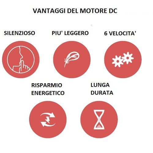 This ceiling fan has DC motor and offers 6 adjustable speeds with a consumption of 3-5-8-12-21-31W and 0-71-93-115-138-162 revolutions per minute depending on speed.
