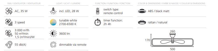 Ανεμιστήρας Οροφής Ø50xH20cm Led 28w 3600lm Tunable 2700-6500K 220-240V,50Hz Μαύρο Ματ-Ράταν Eglo Frana 35148