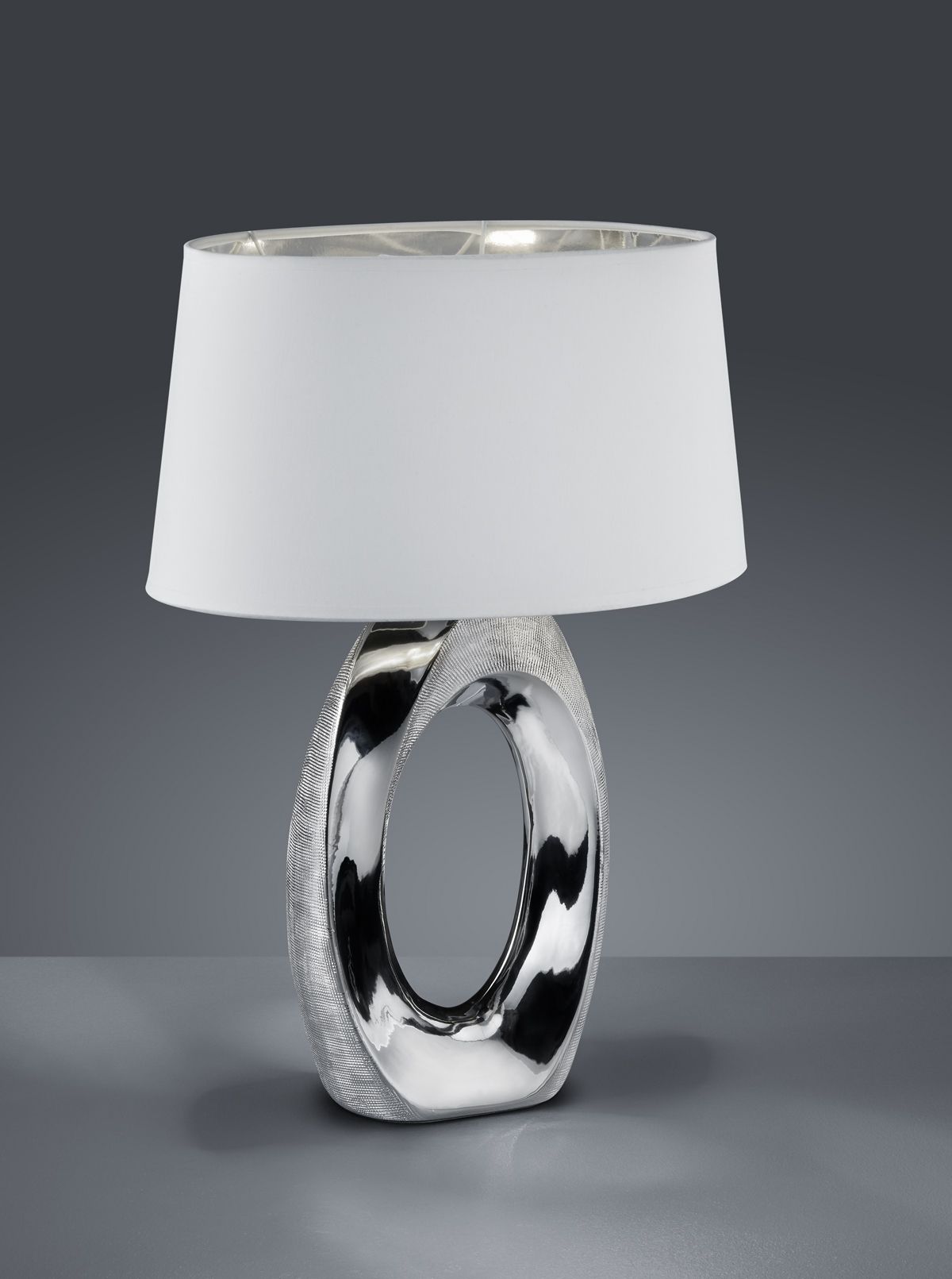 The silver-colored ceramic base, together with the white fabric shade on the outside and silver-colored fabric shade on the inside, creates a modern yet classic overall look that can be ideally