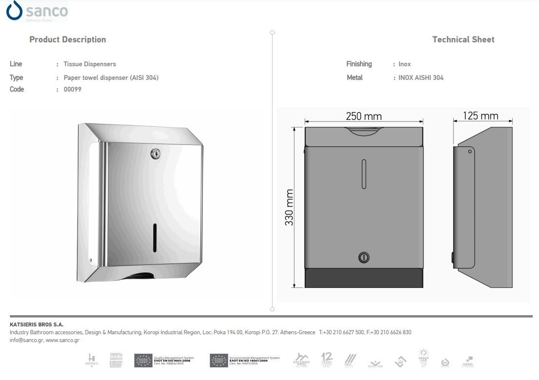 Θήκη για Χειροπετσέτες Επίτοιχη W25xD12,5xH33cm Sanco Tissue Dispensers 099-A90