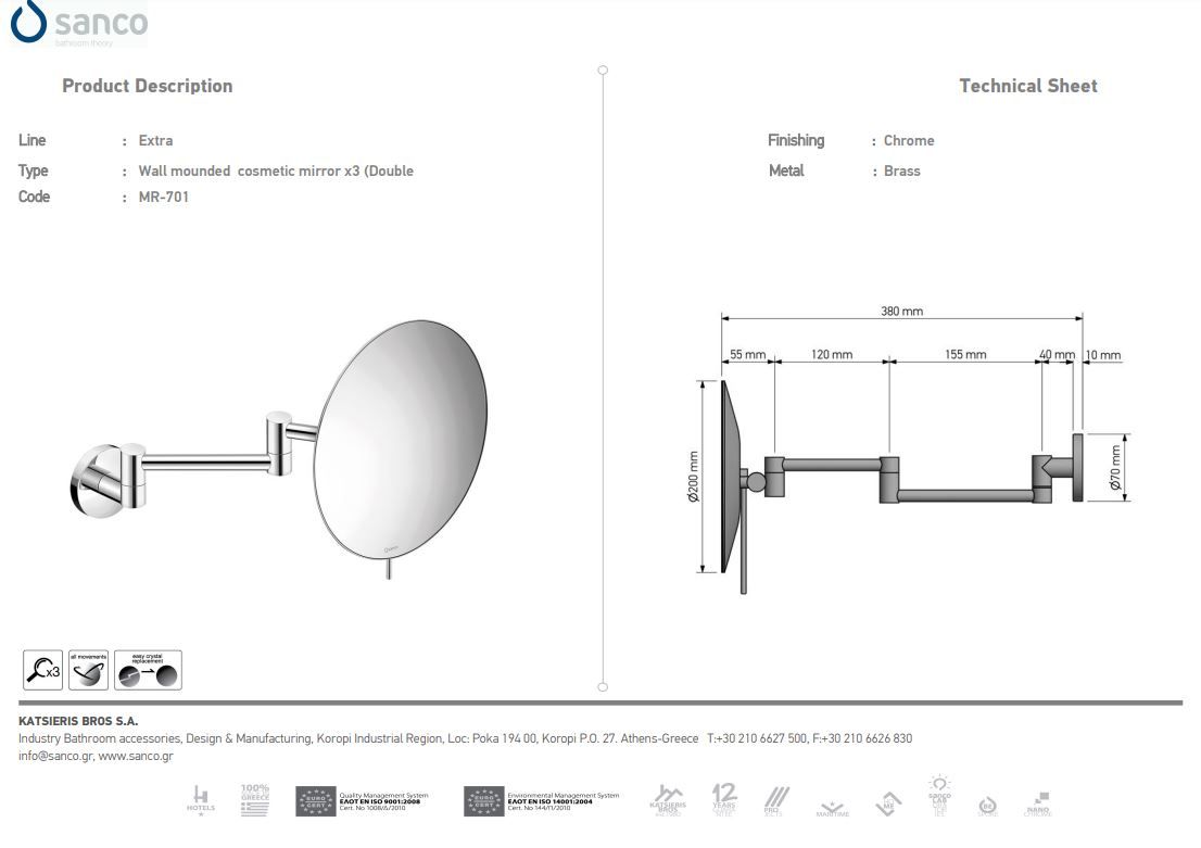 Περιγραφή: Μεγεθυντικός Καθρέπτης x3 Επίτοιχος με Διπλό Βραχίονα