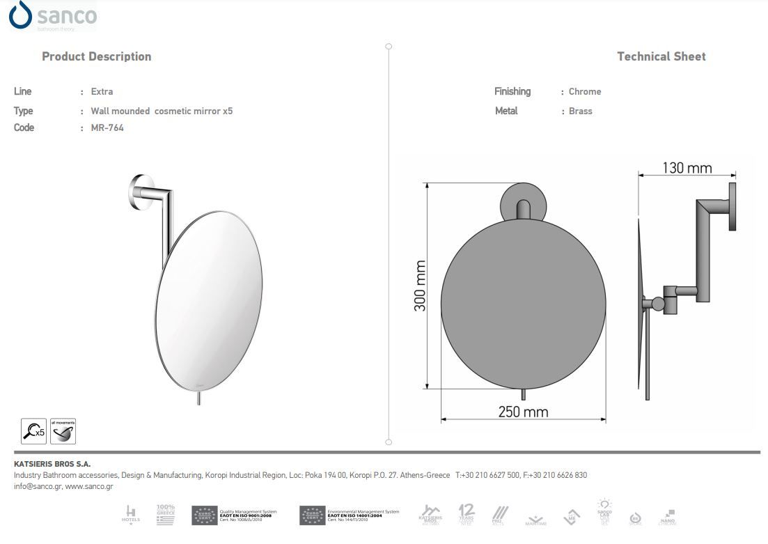 Καθρέπτης Μεγεθυντικός Επιτοίχιος Ø25 εκ. Μεγέθυνση x5 Brushed Brass Sanco Mirrors MR-764-AB12