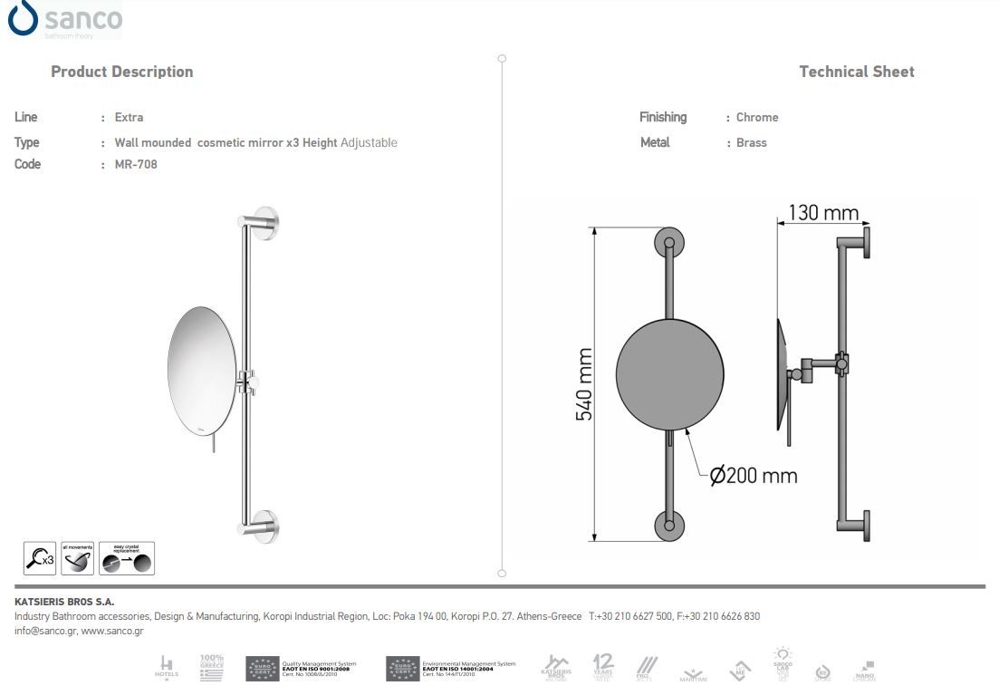 Καθρέπτης Μεγεθυντικός Επιτοίχιος Ρυμθιζόμενου Ύψους Ø20 εκ. Μεγέθυνση x3 Graphite Dark Sanco Mirrors MR-708-122