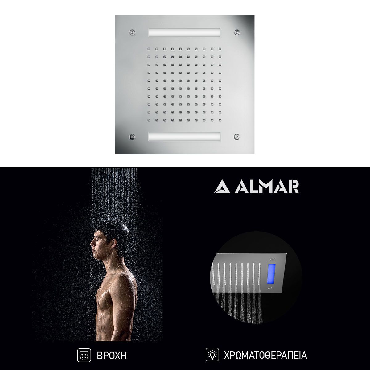 Κεφαλή Ντουζ Εντοιχισμού Οροφής 30x30 με Χρωματοθεραπεία, Almar Inox Chrome E044172-100