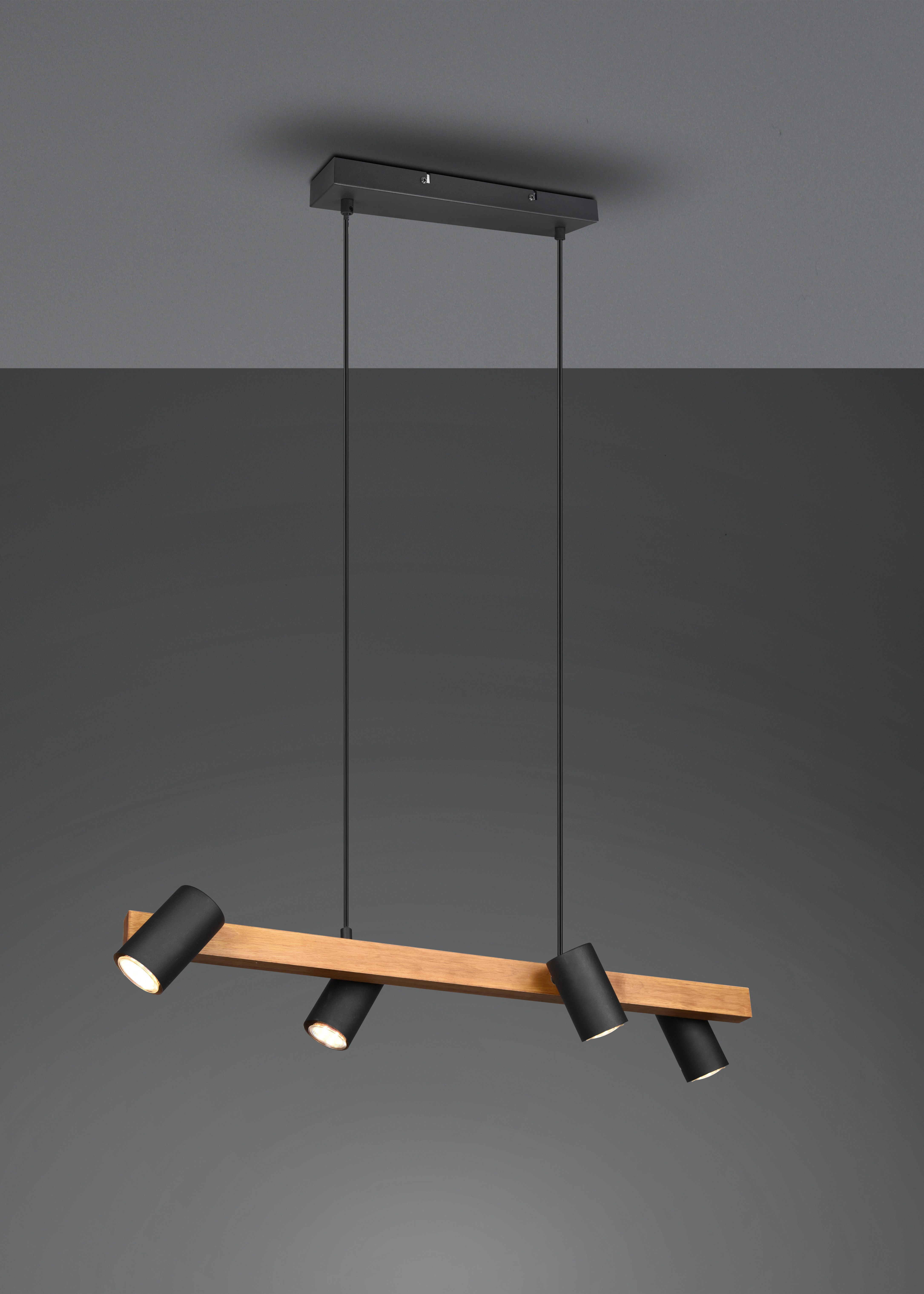 The pendant is designed in matt black and wood and can therefore stylishly complement and complete modern color concepts.