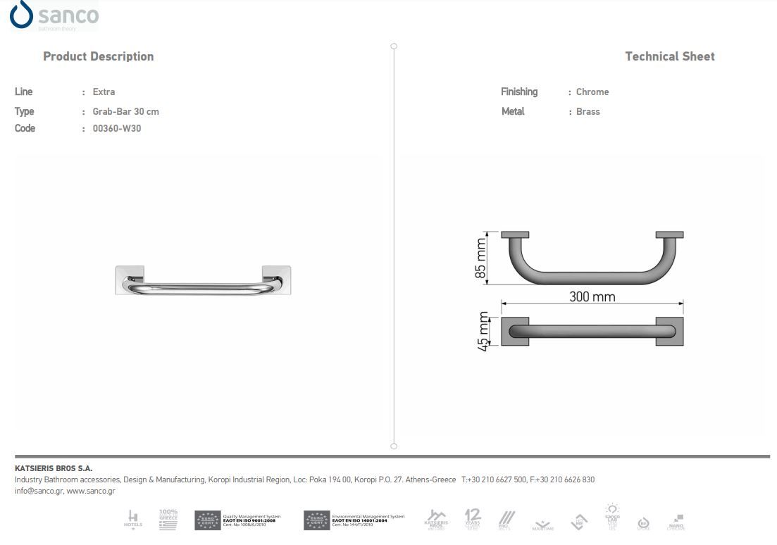 Λαβή Λουτρού Χρωμέ 30cm, Sanco Grab Bars 0360-W30-A03
