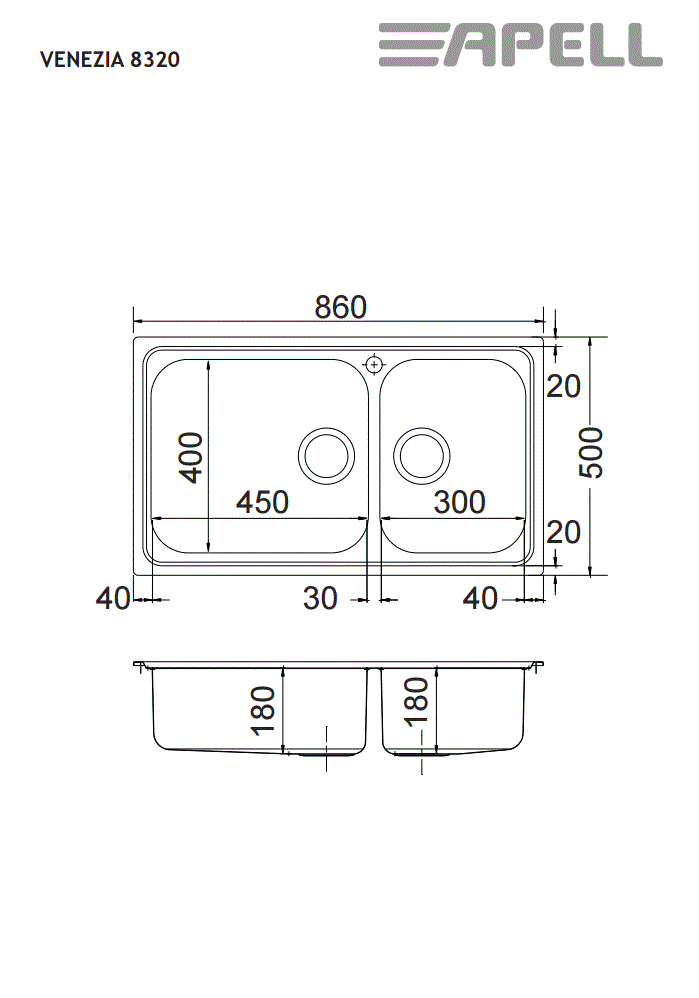 Νεροχύτης Ένθετος Λείος 86x50 εκ. για ερμάριο 90 εκ.Apell Anniversario 8320-110
