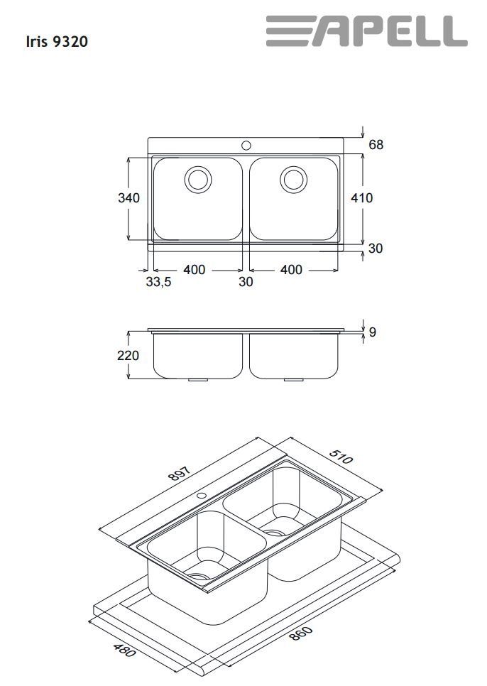 Νεροχύτης Κουζίνας Ανοξείδωτος Iris 89,7x51 Αpell Inox Black glass 9320-110401