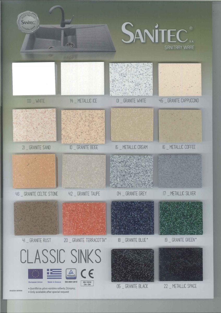 * Οι νεροχύτες Sanitec, απόλυτα εναρμονισμένοι με τις σύγχρονες τάσεις στη διακόσμηση, διατίθενται σε πολλές σειρές μοντέλων και σε μεγάλη ποικιλία αποχρώσεων "γρανίτη" και "ορυκτών μετάλλων".