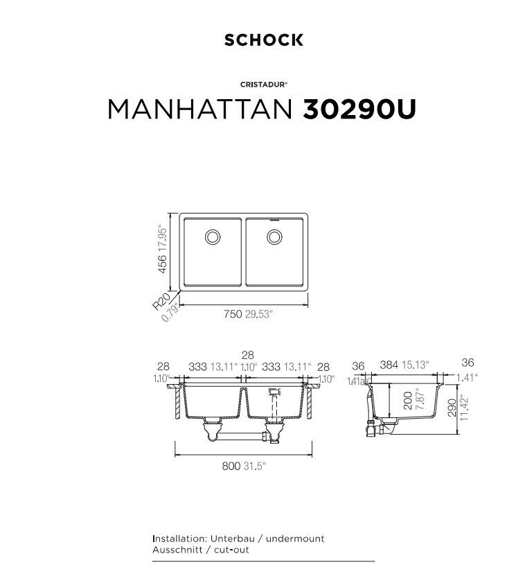 Νεροχύτης Κουζίνας Γρανίτη Manhattan Υποκαθήμενος 75x45,6 Schock Cristalite Nero Granite 30290U-1401
