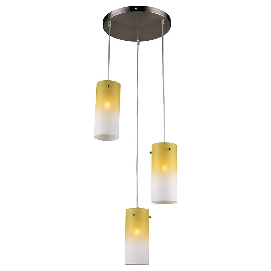 Κρεμαστό φωτιστικό (τρίφωτη ροζέτα) με βάση σε χρώμιο και αμπαζούρ από γυαλί σε λευκό και κίτρινο χρώμα. Ύψος: 100 εκ. Διάμετρος: 30 εκ. Λαμπτήρες: 3 τεμ. Τύπος Λαμπτήρων: G9 Watt: 40