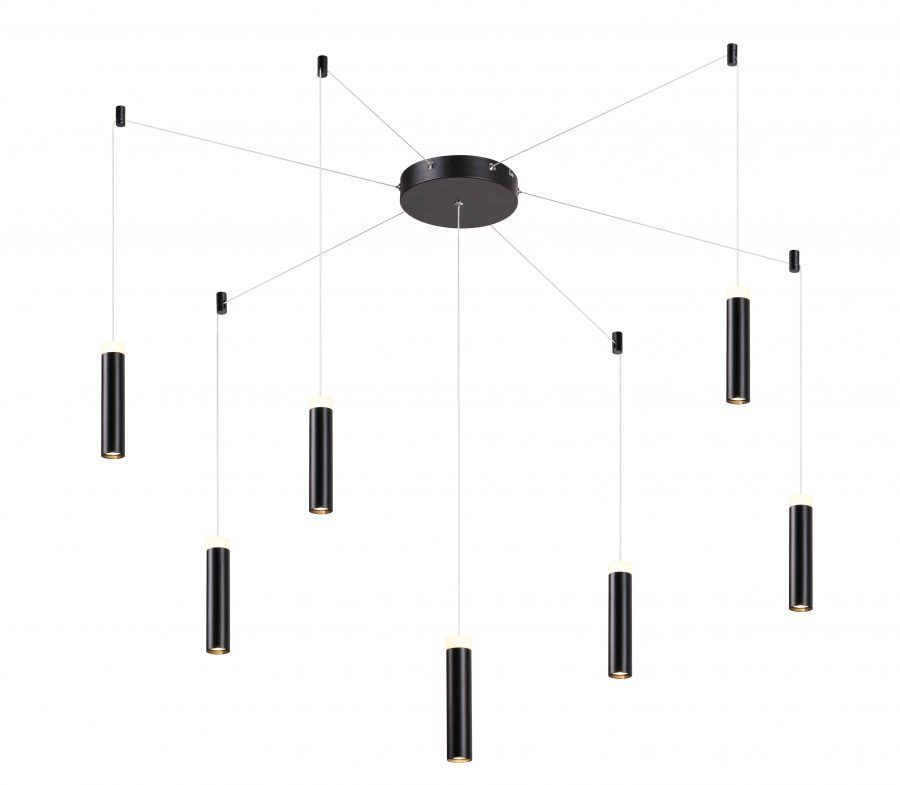 Κρεμαστό πολύφωτο κατασκευασμένο από αλουμίνιο, ακρυλικό και μεταλλική βάση, σε μαύρη ματ απόχρωση και φωτισμό πάνω-κάτω. Με καλώδιο ως και 4 μέτρα που επιτρέπει το σχεδιασμό αράχνης. Ύψος: 4 μ. Λαμπτήρες: 7 τεμ. Τύπος Λαμπτήρα: LED SMD Watt: 7 x 7 Watt 3000K| Χρώμα | Μαύρο-Black |
