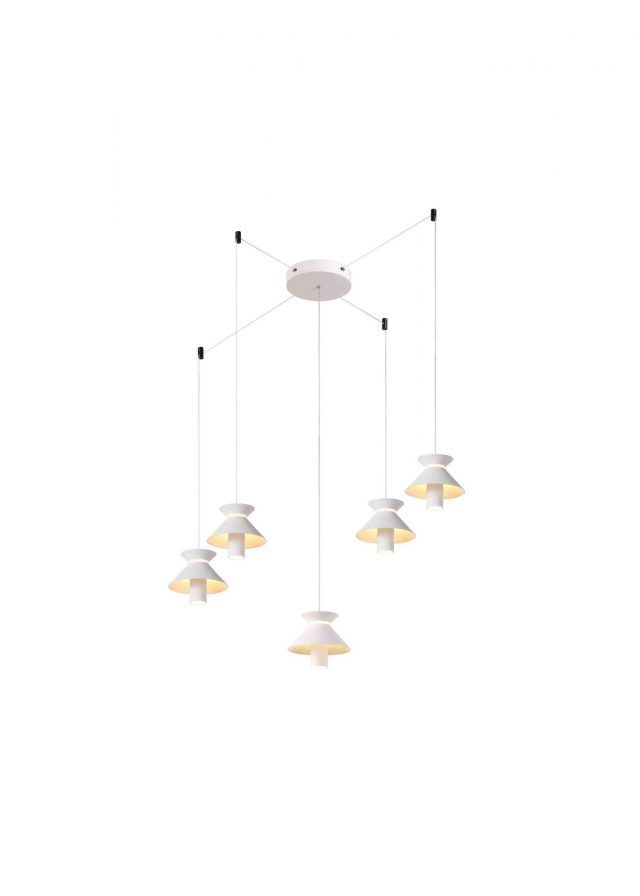 Κρεμαστό πολύφωτο κατασκευασμένο από αλουμίνιο, ακρυλικό και μεταλλική βάση, σε λευκή ματ απόχρωση. Με καλώδιο ως και 4 μέτρα που επιτρέπει το σχεδιασμό αράχνης. Ύψος: 4 μ. Λαμπτήρες: 5 τεμ. Τύπος Λαμπτήρα: LED SMD Watt: 5 x 8 Watt 3000KΠΟΛΥΦΩΤΟ-ΚΡΕΜΑΣΤΟ ΦΩΤΙΣΤΙΚΟ