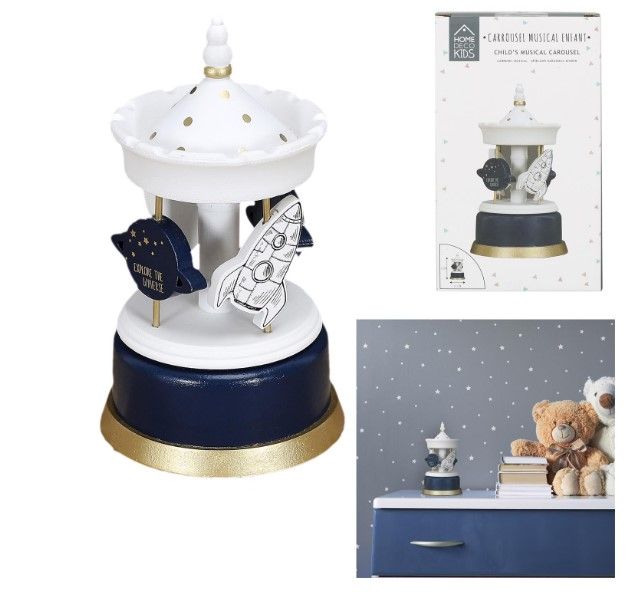 Παιδικό Μουσικό Καρουζέλ Ξύλινο Διάστημα σε Λευκό, Μπλε και Χρυσό χρώμα με διαστάσεις 20.30×11.50×11.50 cm.