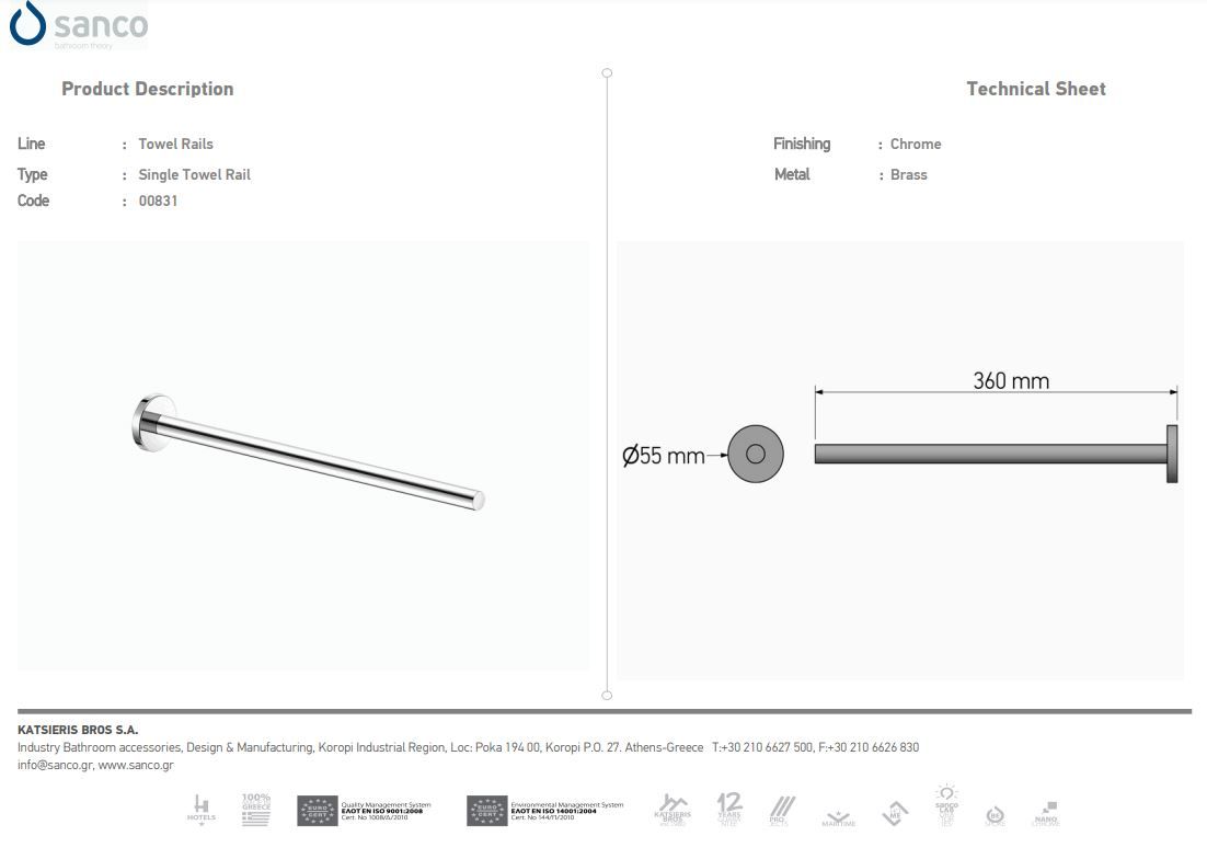Πετσετοκρεμάστρα Μονή Κάθετης Στήριξης W5,5xD36xH5,5 cm Chrome Sanco Towel Rails 0831-A03