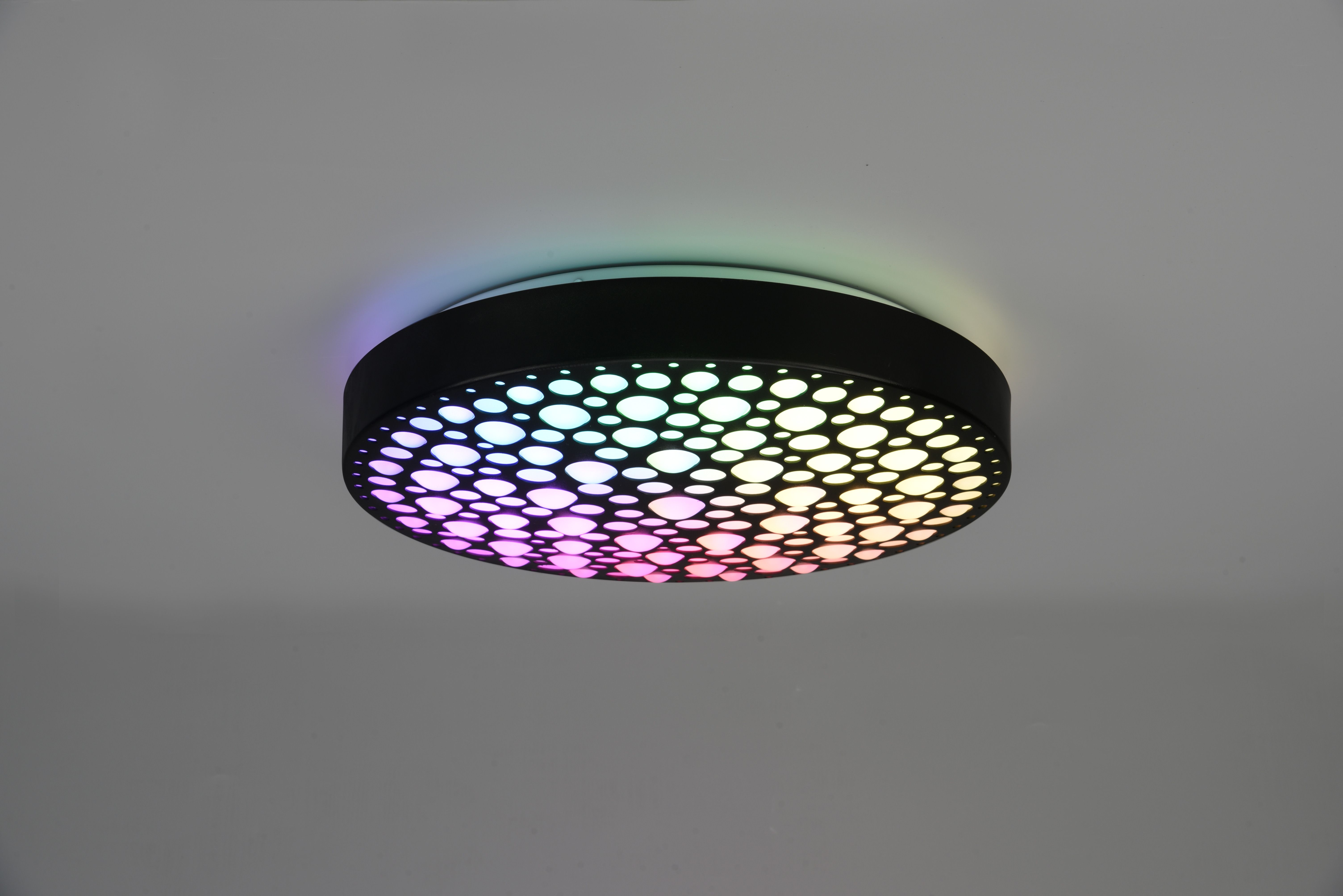 Μοντέρνα πλαφονιέρα οροφής της Trio Lighting σε μαύρο χρώμα, από πλαστικό. Διαθέτει ενσωματωμένο LED, το οποίο μπορεί να πάρει διάφορες αποχρώσεις συνδυάζοντας τα χρώματα, κόκκινο, πράσινο και μπλε.
