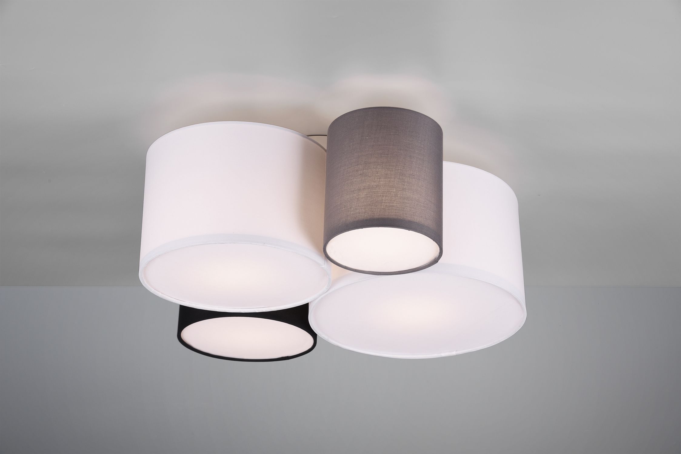Two white, one black, and one grey fabric shade together create a harmonious combination that can be used in a variety of ways.