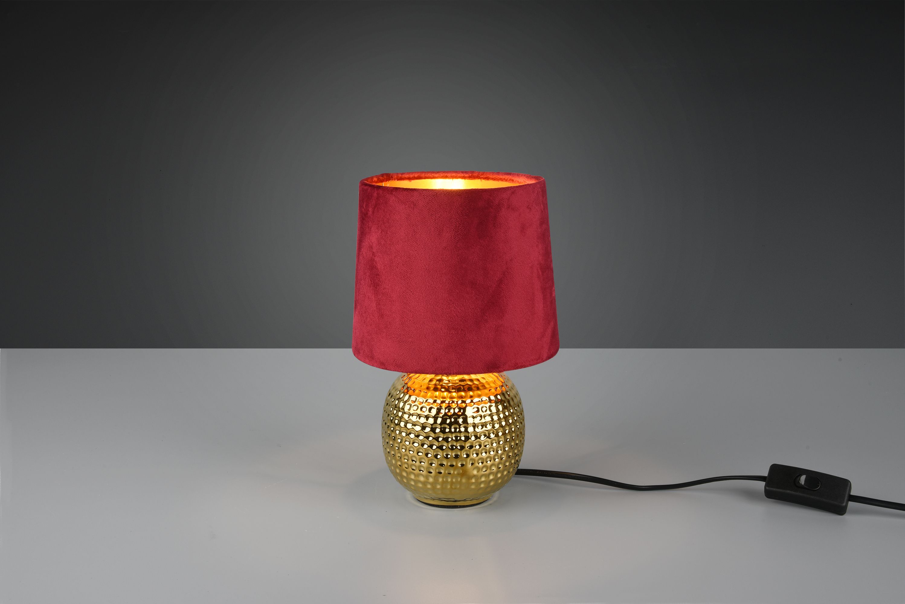 The combination of ceramic in gold and the fabric shade in red creates a modern look. For energy-saving lighting, it is recommended to use an LED illuminant.