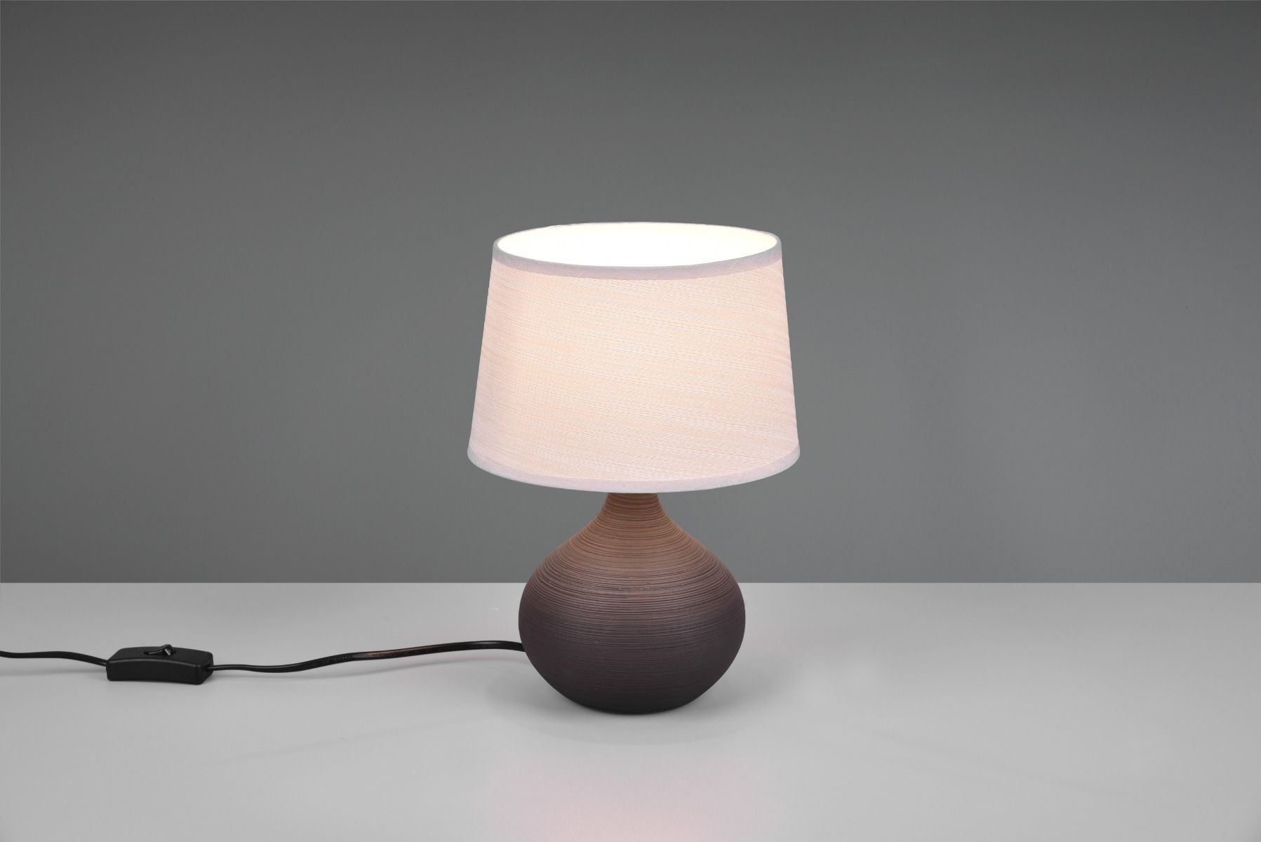 The brown ceramic base with white fabric shade not only creates a cozy ambiance but also adds a modern touch.