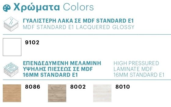 - Αποχρώσεις μελαμίνης όψης ξύλου Pine White, Grey Craft, Noce & Light Hickory