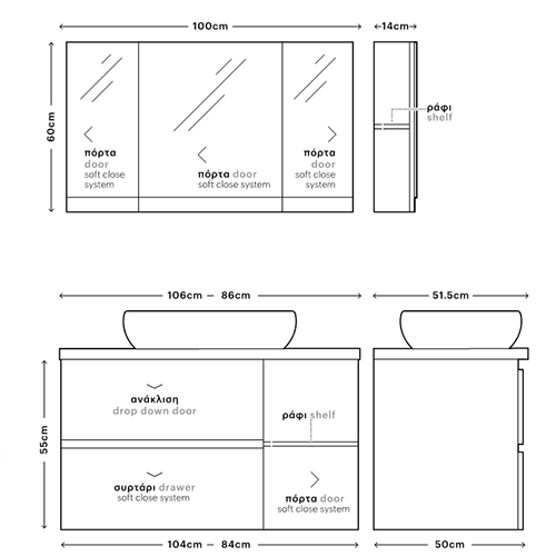 Σετ Έπιπλο Μπάνιου Μ106xB50xY55cm Βάση-Πάγκος Solid-Νιπτήρας-Καθρέπτης-Φωτιστικό Laminate Μελαμίνη Possitano Savvopoulos Funky 002