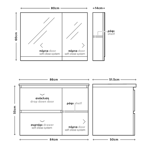 Η βάση του επίπλου διαθέτει δύο συρτάρια το ένα με ανάκλιση και δεξιά Πόρτα δύο ράφια. Στον αποθηκευτικό χώρο μπορείτε να αποθηκεύσετε πετσέτες, καλλυντικά και οτιδήποτε είναι χρήσιμο στην καθημερινότητά σας.