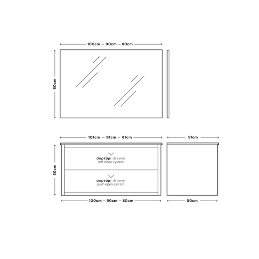 Το σετ Περιλαμβάνει: Βάση Επίπλου με συρτάρια- Νιπτήρα- Καθρέπτη-Φωτιστικό