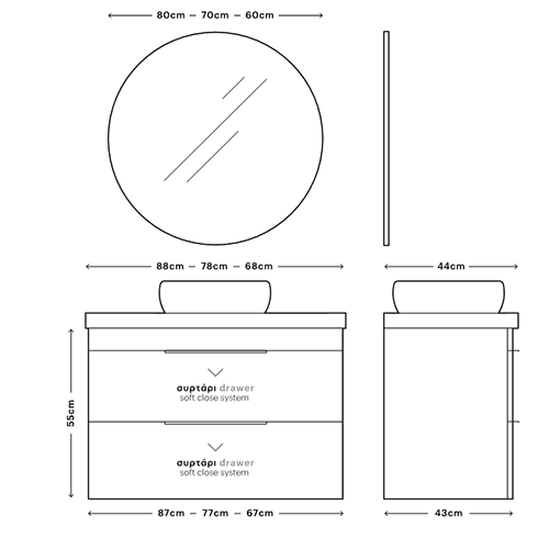 Η σειρά Likno είναι κατασκευασμένη από υψηλής ποιότητας και αντοχής υλικά, ειδικά επιλεγμένα για να αντέχουν στις σκληρές και δύσκολες συνθήκες του χώρου του μπάνιου. Κατασκευάζεται από mdf υψηλής αντοχής.