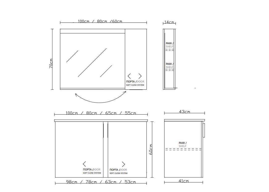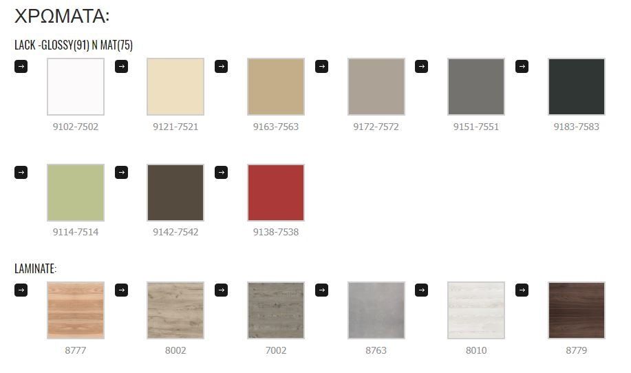 Η συγκεκριμένη σύνθεση της σειράς παράγεται σε 4 διαστάσεις 100-80-65-55cm με νιπτήρα ενιαίο πορσελάνης, σε εννέα αποχρώσεις λάκας σε γυαλιστερό ή ματ τελείωμα και σε έξι αποχρώσεις μελαμίνης όψης ξύλου.