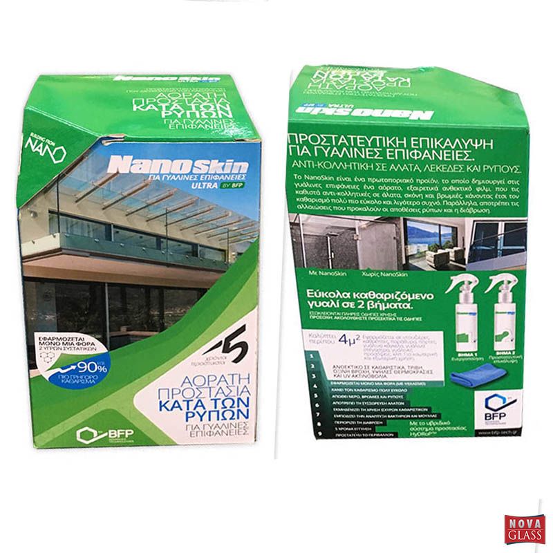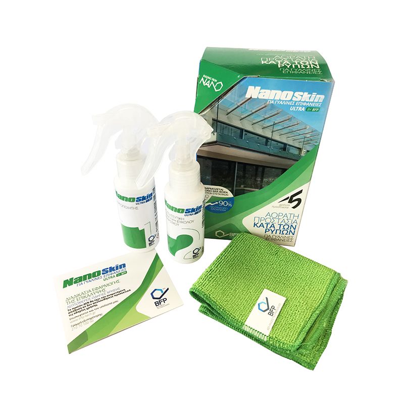 Το Nano Skin Ultra είναι ένα πρωτοποριακό προϊόν, το οποίο δημιουργεί στις γυάλινες επιφάνειες ένα αόρατο, εξαιρετικά ανθεκτικό φιλμ, που τις καθιστά αντικολλητικές σε άλατα, σκόνη και βρωμιές, κάνοντας έτσι τον καθαρισμό πολύ πιο εύκολο και λιγότερα συχνό. Παράλληλα, αποτρέπει τις αλλοιώσεις που προκαλούν οι αποθέσεις ρύπων και η διάβρωση.