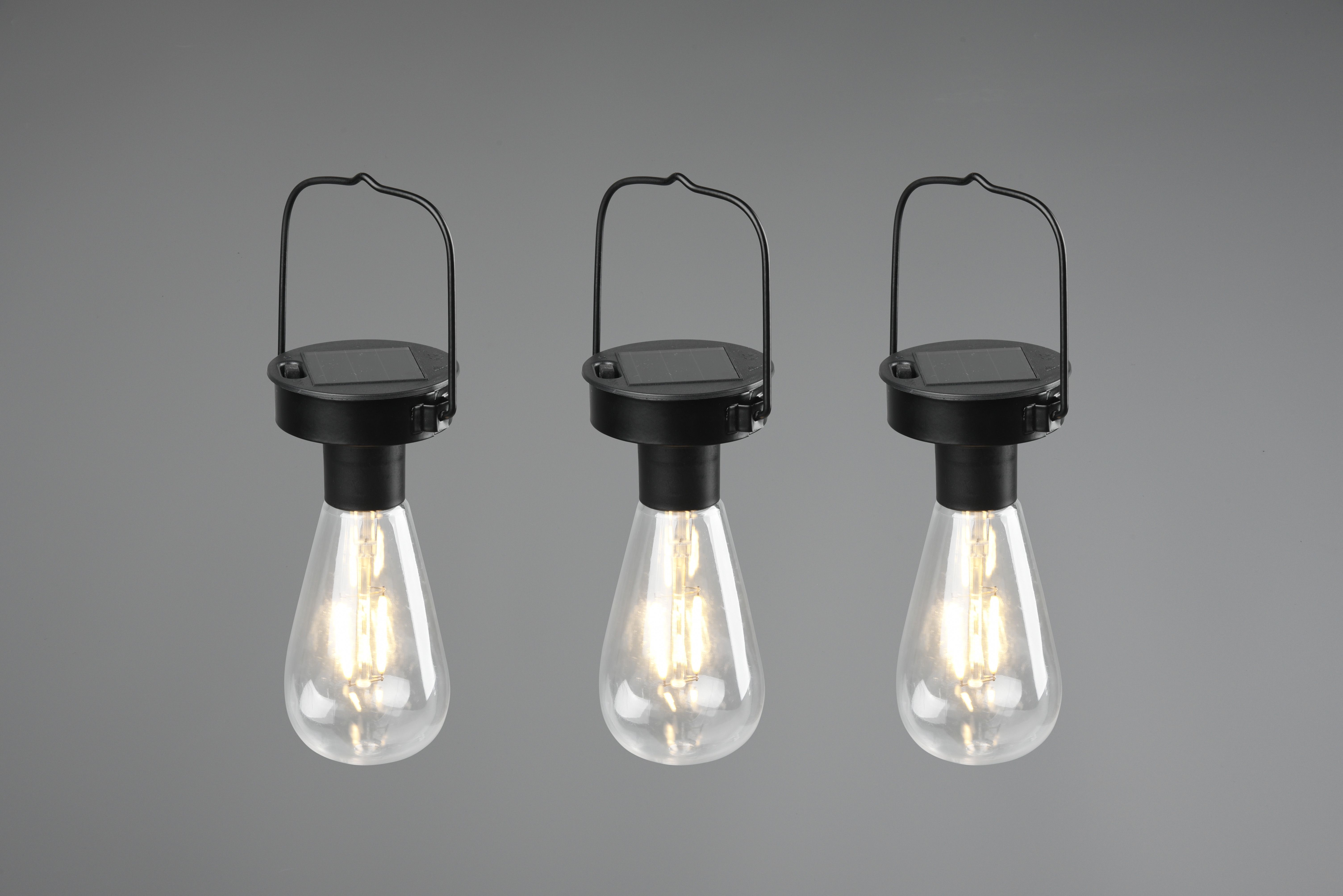 The set of 3 CAMPUS solar lights sets attractive accents in the garden and can be flexibly hung from trees, bushes or even a parasol using the large brackets. The integrated twilight sensor automatically switches the lights on when it gets dark and off again when it gets light, creating a special atmosphere in your home. The solar light in light bulb design has a lighting time of 8 hours and a charging time of approx. 8 hours. Thanks to its IP44 protection rating, the light is protected against splashing water and can therefore be used in a variety of ways. The black matt stainless steel socket draws all the attention to the light bulb look of the transparent plastic luminaire, creating an eye-catching feature in your outdoor area. In addition, the luminaire features modern LED technology, which is characterised by high light quality and energy efficiency. Compared to conventional halogen lamps, up to 80% of energy costs can be saved. In addition, LED light sources have a long service life, produce less heat and protect the environment.