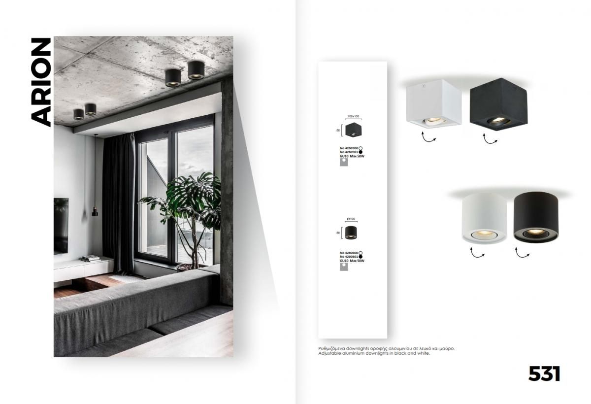 Στην οικογένεια Viokef Arion διατίθενται σε Λευκό & Μαύρο Μονόφωτο Στρογγυλό & Τετράγωνο, Δίφωτο.