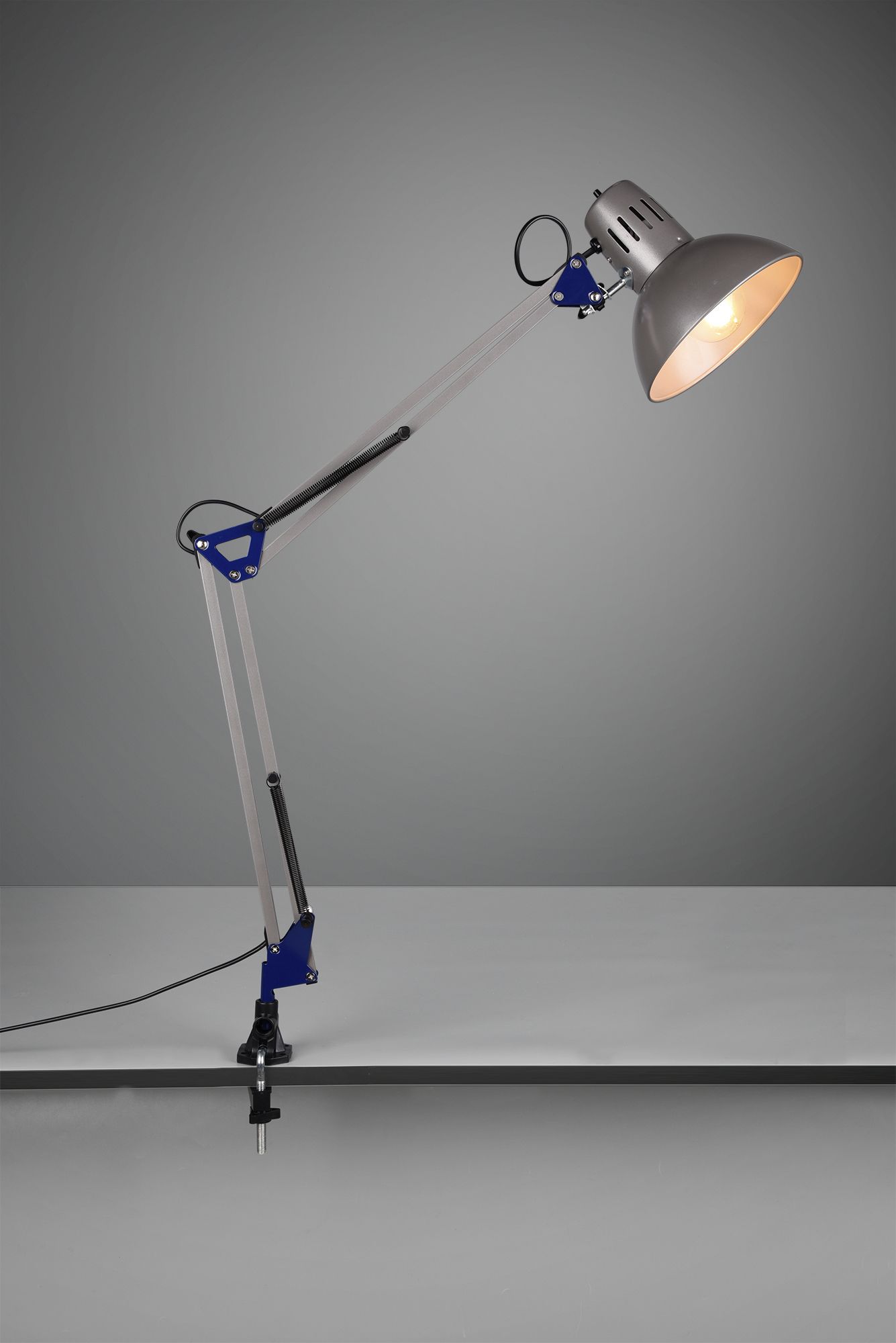 The light is equipped with a switch and can be flexibly attached to table edges using the clamp.