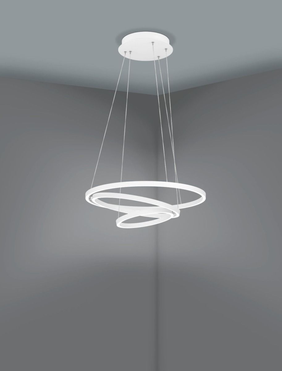 The LOBINERO-Z LED pendant light from the connect. Z Smart home range features a black steel frame with three suspended ring-shaped LED profiles, which are individually adjustable.