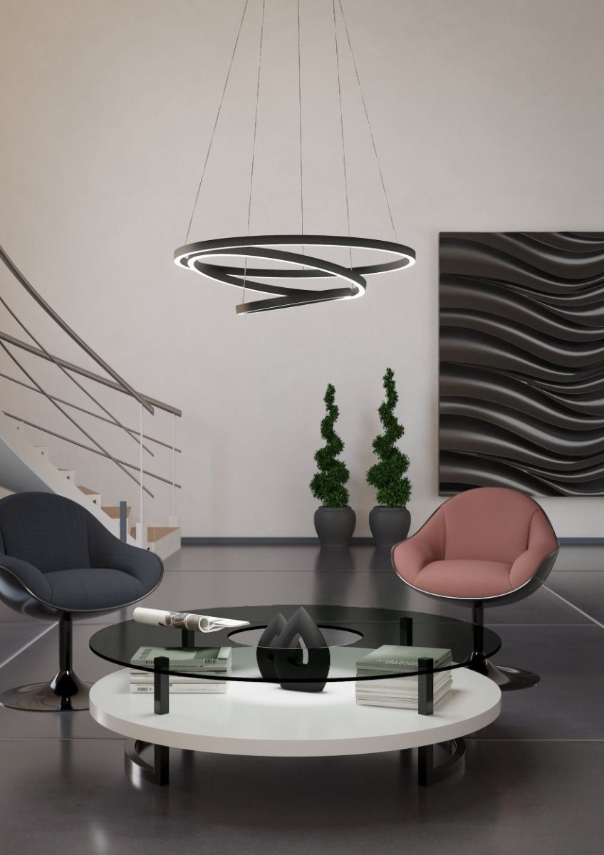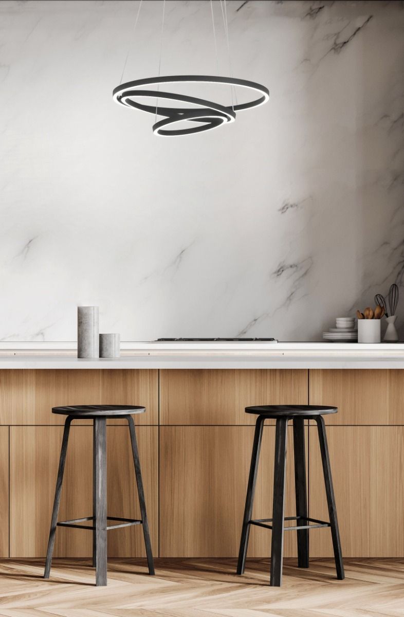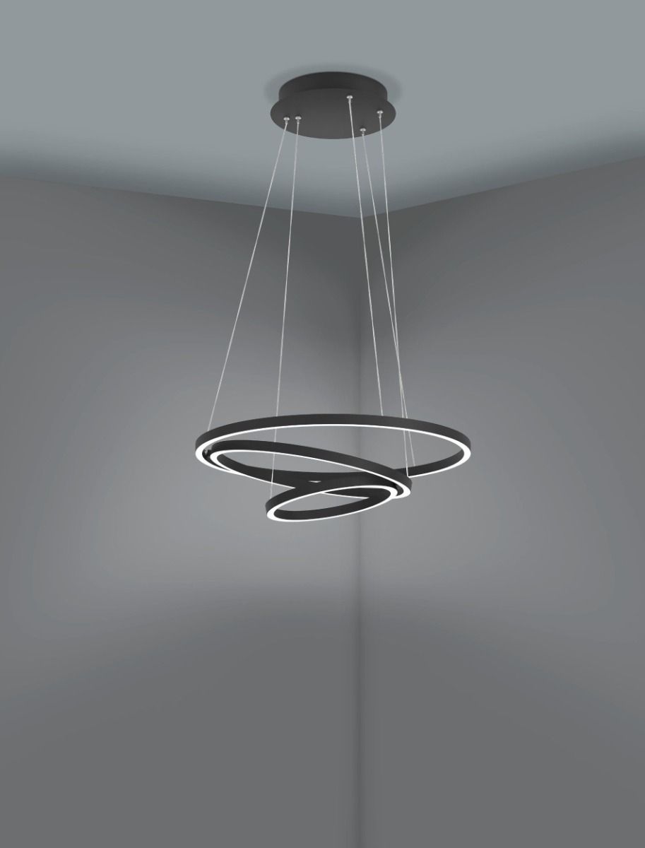 The LOBINERO-Z LED pendant light from the connect. Z Smart home range features a black steel frame with three suspended ring-shaped LED profiles, which are individually adjustable.