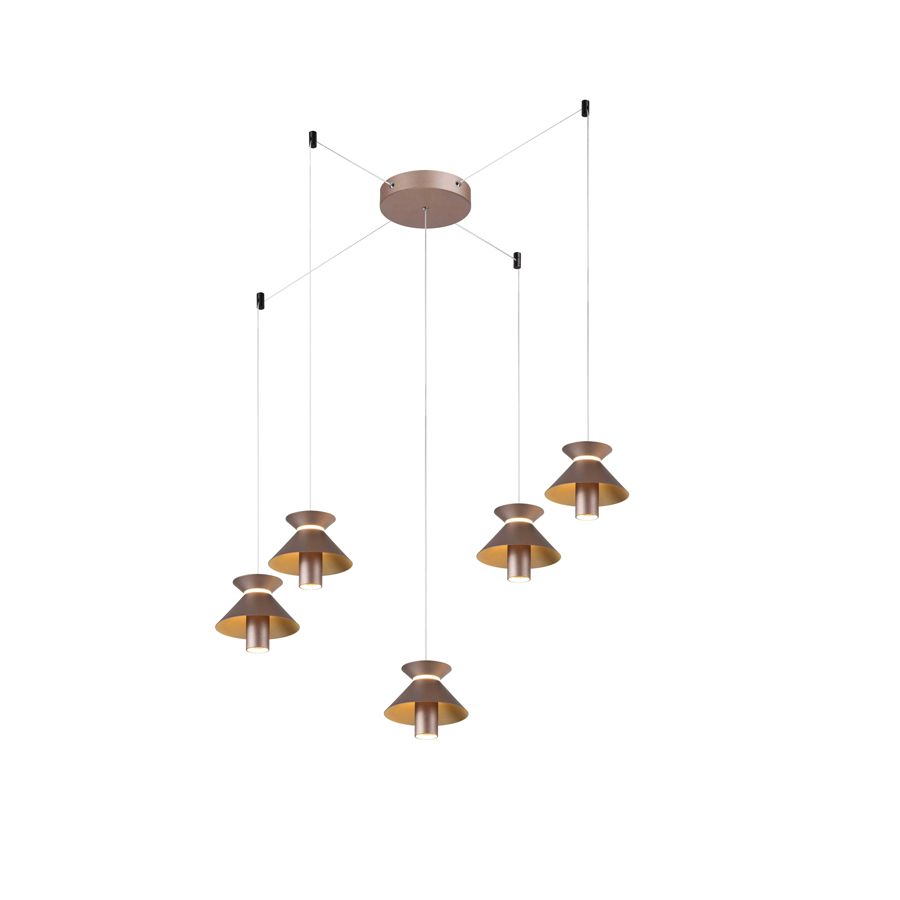 Κρεμαστό πολύφωτο κατασκευασμένο από αλουμίνιο, ακρυλικό και μεταλλική βάση, σε χρυσή ματ απόχρωση. Με καλώδιο ως και 4 μέτρα που επιτρέπει το σχεδιασμό αράχνης. Ύψος: 4 μ. Λαμπτήρες: 5 τεμ. Τύπος Λαμπτήρα: LED SMD Watt: 5 x 8 Watt 3000K| Χρώμα | Χρυσό-Ορείχαλκος |