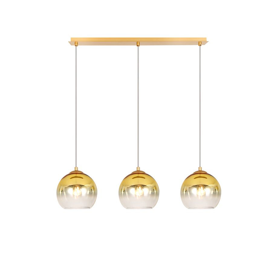 Τρίφωτο κρεμαστό φωτιστικό σε ράγα κατασκευασμένο από χειροποίητα γυαλιά σε χρυσό ντεγκραντέ και μεταλλική βάση σε χρυσό ματ.Ύψος: 120 εκ.Διάμετρος Γυαλιού : 18 εκ.Μήκος: 70 εκ.Λαμπτήρες: 3 τεμ.Τύπος Λαμπτήρα: Ε27Watt: 60| Χρώμα | Χρυσό-Ορείχαλκος |