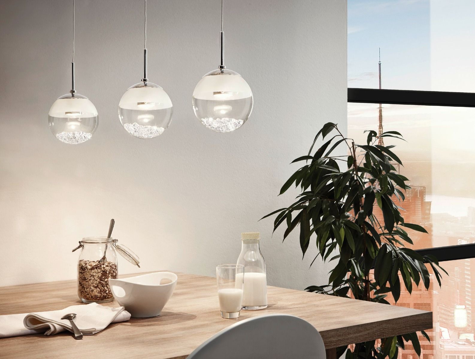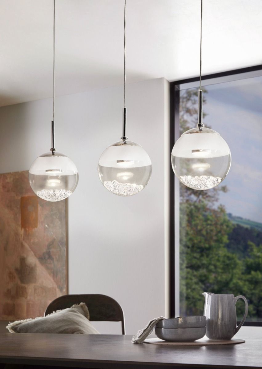 The MONTEFIO 1 LED pendant light features three spherical heads made from clear and satin glass.