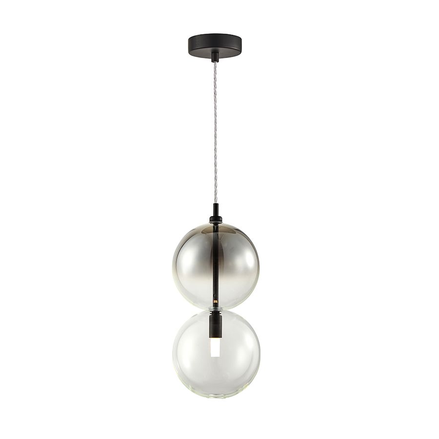 Μονόφωτο κρεμαστό φωτιστικό κατασκευασμένο από χειροποίητο γυαλί σε αποχρώσεις διάφανου και χρωμίου με μαύρα μεταλλικά στοιχεία.