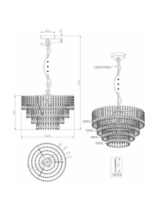 Φωτιστικό Πολυέλαιος Ø42xY150 εκ. Τρίφωτος 3xE14 Μέταλλο Χρωμέ-Ακρυλικό Διάφανο Trio RL Orient R13473006