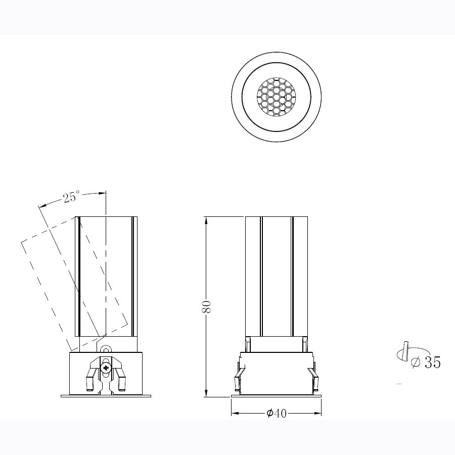 Watt: 7 W LUMEN: 505 lm Τύπος Λαμπτήρα: COB LED Γωνία Δέσμης: 24º Δείκτης UGR: <19 Θερμοκρασία Χρώματος: CCT DIP Switch (2700/3000/4000K), CRI≥90 Διάμετρος: 4 εκ. Γωνία στρέψης: 25° Διάμετρος οπής τοποθέτησης: 3.5 εκ. Βάθος: 9,7 εκ. Driver: Εμπεριέχεται Υλικό: Αλουμίνιο