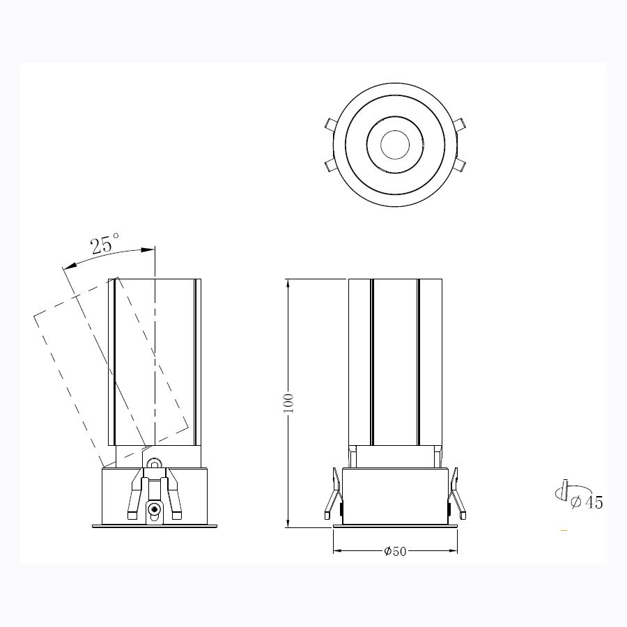 Watt: 10 W LUMEN: 709 lm Τύπος Λαμπτήρα: COB LED Γωνία Δέσμης: 36º Δείκτης UGR: <19 Θερμοκρασία Χρώματος: CCT DIP Switch (2700/3000/4000K), CRI≥90 Διάμετρος: 5 εκ. Γωνία στρέψης: 25° Διάμετρος οπής τοποθέτησης: 4.5 εκ. Βάθος: 15,3 εκ. Driver: Εμπεριέχεται Υλικό: Αλουμίνιο