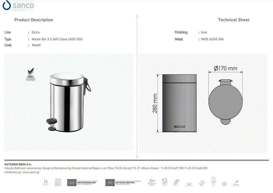 Χαρτοδοχείο 3lt Soft Closιng System Graphite Dark Sanco Waste Bins 90689-122