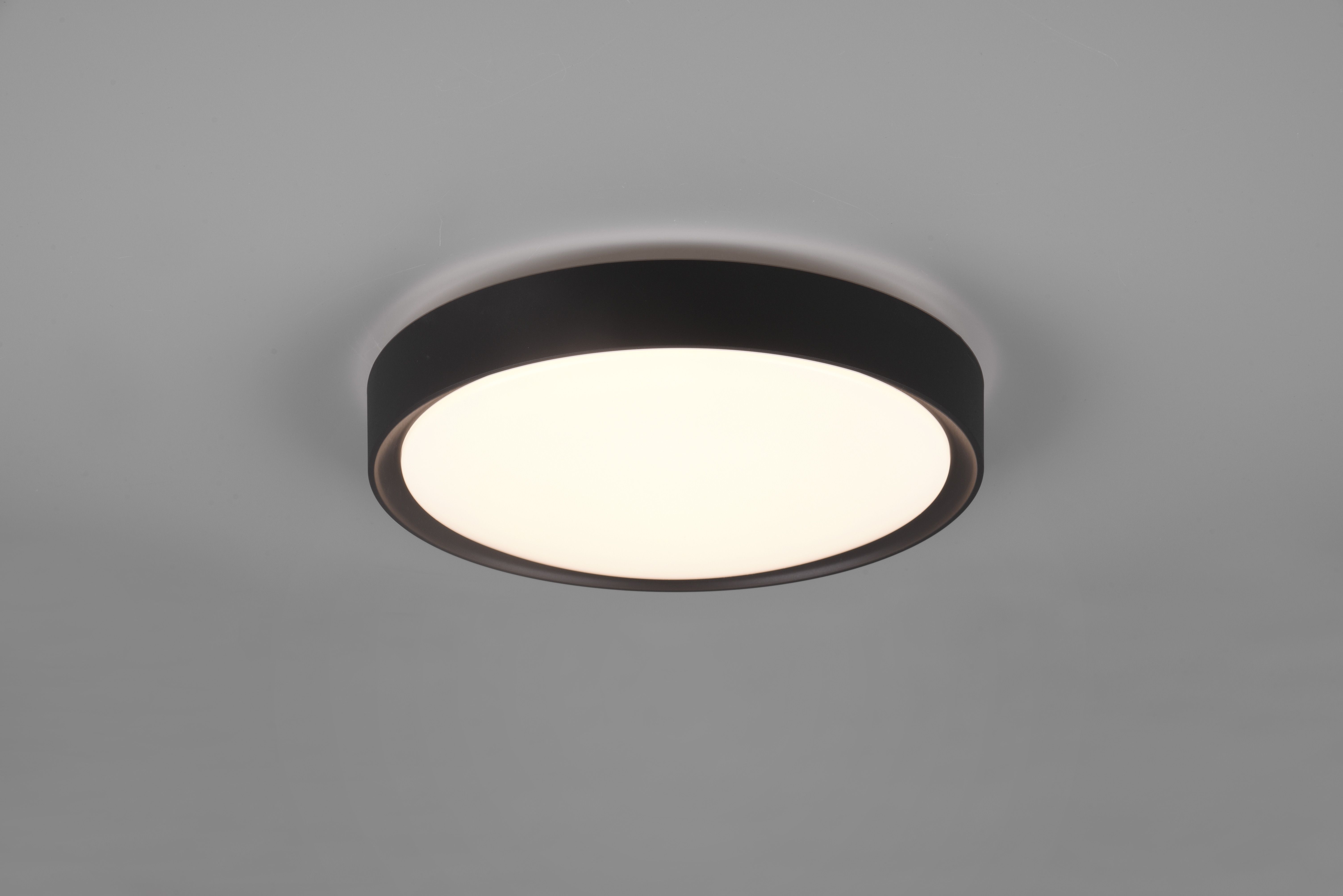 Μοντέρνα πλαφονιέρα οροφής της Trio Lighting σε μαύρο χρώμα, από πλαστικό. Διαθέτει ενσωματωμένο LED, το οποίο εκπέμπει θερμό λευκό φως που αποδίδεται στην κλίμακα Kelvin με τιμές από 2400Κ έως 3800Κ. Αυτοί οι τόνοι του λευκού είναι πιο κίτρινοι σε σχέση με το φυσικό φως.