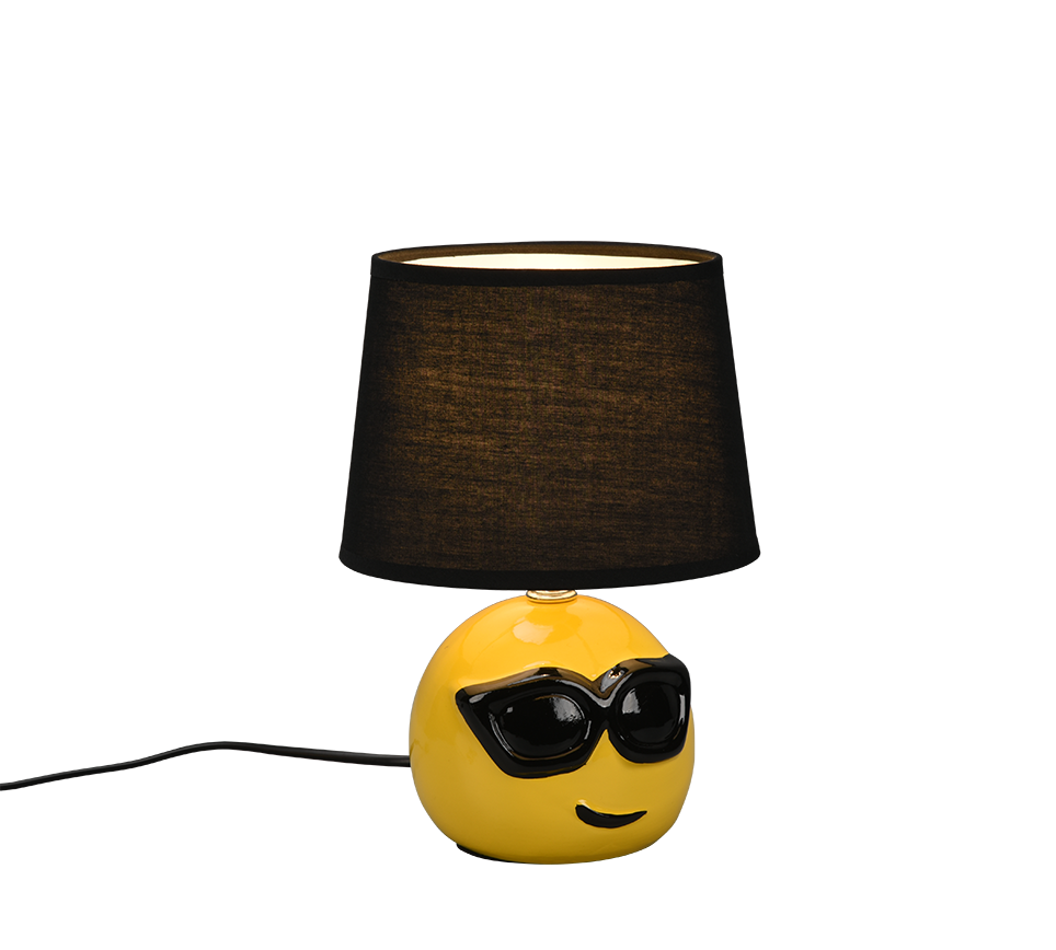 The fun COOLIO table lamp sets special accents in your home. The table lamp in the unusual smiley look is a real eye-catcher when switched on or off. This unusual lamp can enchant in the youth room on the bedside table as well as in the living area on the chest of drawers. The lamp is equipped with a cord switch, which makes it convenient to switch it on and off. The ceramic base is designed in yellow and the textile shade in black, so that it becomes a real highlight in your interior. For energy-saving lighting, it is recommended to use an LED illuminant. These are an optimal alternative to conventional halogen lamps and stand for a high quality of light and energy savings of up to 80%. In addition, LED lamps help you benefit from a long service life, low heat generation and at the same time protect the environment.