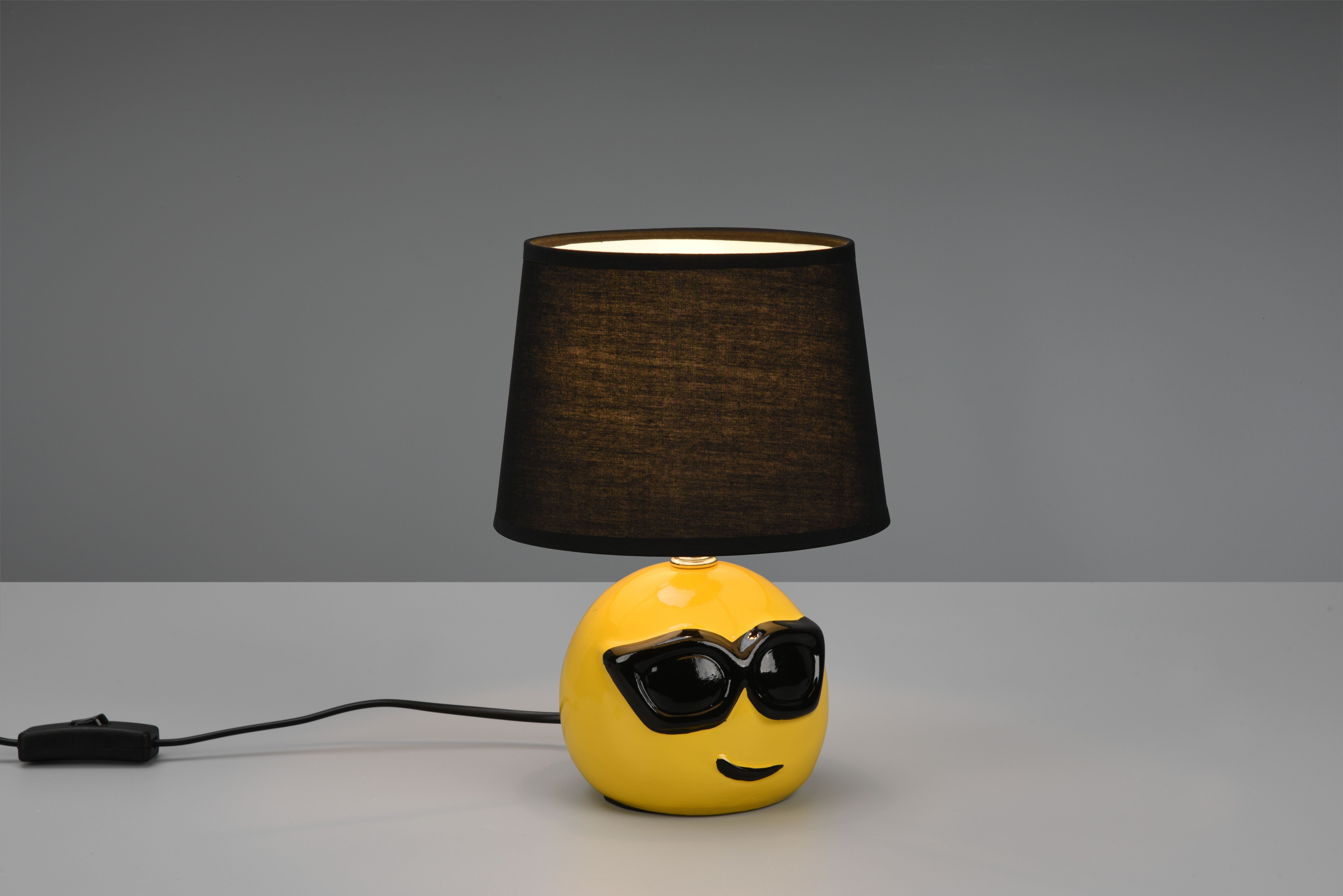 The fun COOLIO table lamp sets special accents in your home. The table lamp in the unusual smiley look is a real eye-catcher when switched on or off. This unusual lamp can enchant in the youth room on the bedside table as well as in the living area on the chest of drawers. The lamp is equipped with a cord switch, which makes it convenient to switch it on and off. The ceramic base is designed in yellow and the textile shade in black, so that it becomes a real highlight in your interior.  For energy-saving lighting, it is recommended to use an LED illuminant. These are an optimal alternative to conventional halogen lamps and stand for a high quality of light and energy savings of up to 80%. In addition, LED lamps help you benefit from a long service life, low heat generation and at the same time protect the environment.