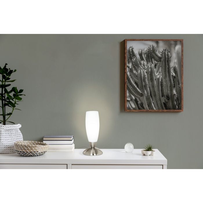 Επιτραπέζιο διακοσμητικό φωτιστικό της Eglo, σε λευκό χρώμα. Διαθέτει ανταλλάξιμο λαμπτήρα συμβατό με ντουί E14.