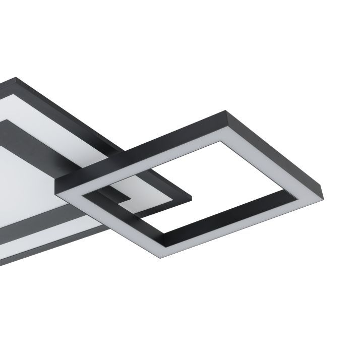 Μοντέρνα πλαφονιέρα οροφής της Eglo σε μαύρο χρώμα, από μέταλλο. Διαθέτει ενσωματωμένο LED, το οποίο μπορεί να πάρει διάφορες αποχρώσεις συνδυάζοντας τα χρώματα, κόκκινο, πράσινο, μπλε και λευκό.
