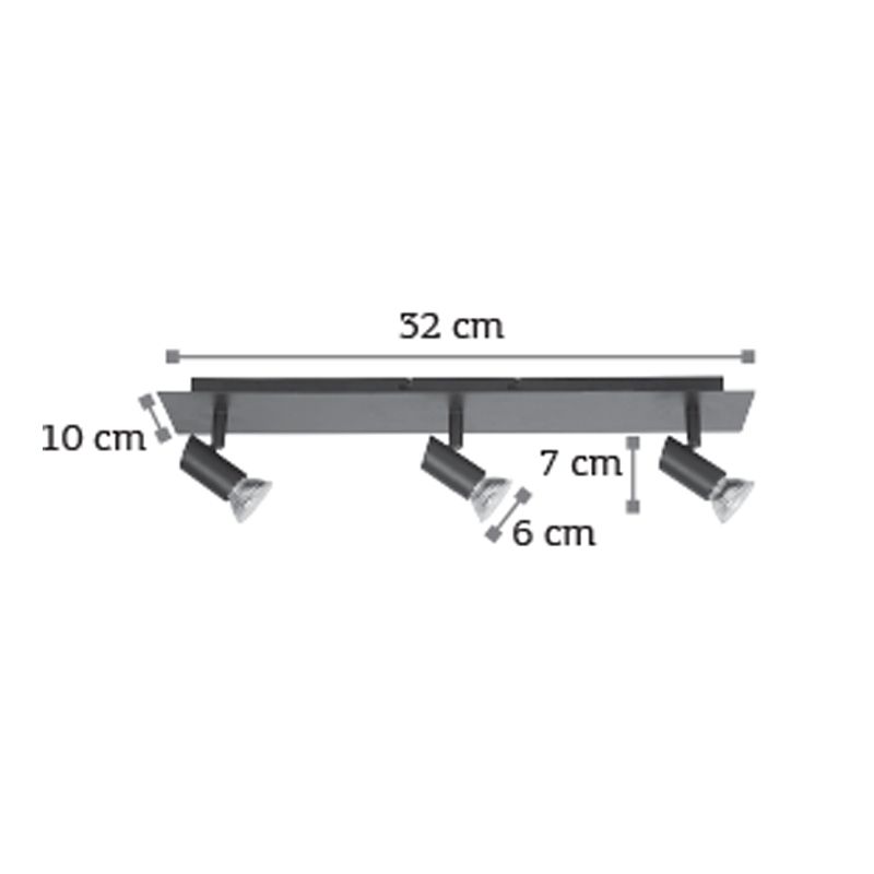 Πρόκειται για ένα μεταλλικό σποτ σε μαύρη απόχρωση με τρεις λαμπτήρες. Το μπροστινό μέρος του κινείται προς οποιαδήποτε κατεύθυνση. Πρόκειται για ένα μεταλλικό σποτ σε μαύρη απόχρωση με τρεις λαμπτήρες. Το μπροστινό μέρος του κινείται προς οποιαδήποτε κατεύθυνση.