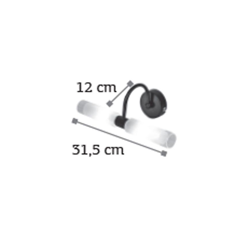 Πρόκειται για ένα επιτοίχιο φωτιστικό κατασκευασμένο από μέταλλο σε μαύρη απόχρωση με δύο λαμπτήρες που καλύπτονται από κυλινδρικό γυαλί αμμοβολής με διάφανες λεπτομέρειες. Είναι η ιδανική επιλογή για φωτισμό μπάνιου τοποθετημένο πάνω από τον καθρέπτη αφού το φως διαχέεται ομοιόμορφα. Πρόκειται για ένα επιτοίχιο φωτιστικό κατασκευασμένο από μέταλλο σε μαύρη απόχρωση με δύο λαμπτήρες που καλύπτονται από κυλινδρικό γυαλί αμμοβολής με διάφανες λεπτομέρειες. Είναι η ιδανική επιλογή για φωτισμό μπάνιου τοποθετημένο πάνω από τον καθρέπτη αφού το φως διαχέεται ομοιόμορφα.
